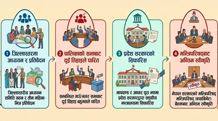 सङ्घीय मामिला तथा सामान्य प्रशासन मन्त्रालयले तयार पारेको ‘गाउँपालिका तथा नगरपालिका र वडाको सङ्ख्या तथा सीमाना हेरफेर, एक आपसमा गाभिने र नगरपालिका वर्गीकरणको पुनरावलोकन सम्बन्धी मापदण्ड, २०८३’ को प्रारम्भिक मस्यौदामा यसको स्पष्ट प्रक्रिया तोकिएको छ ।